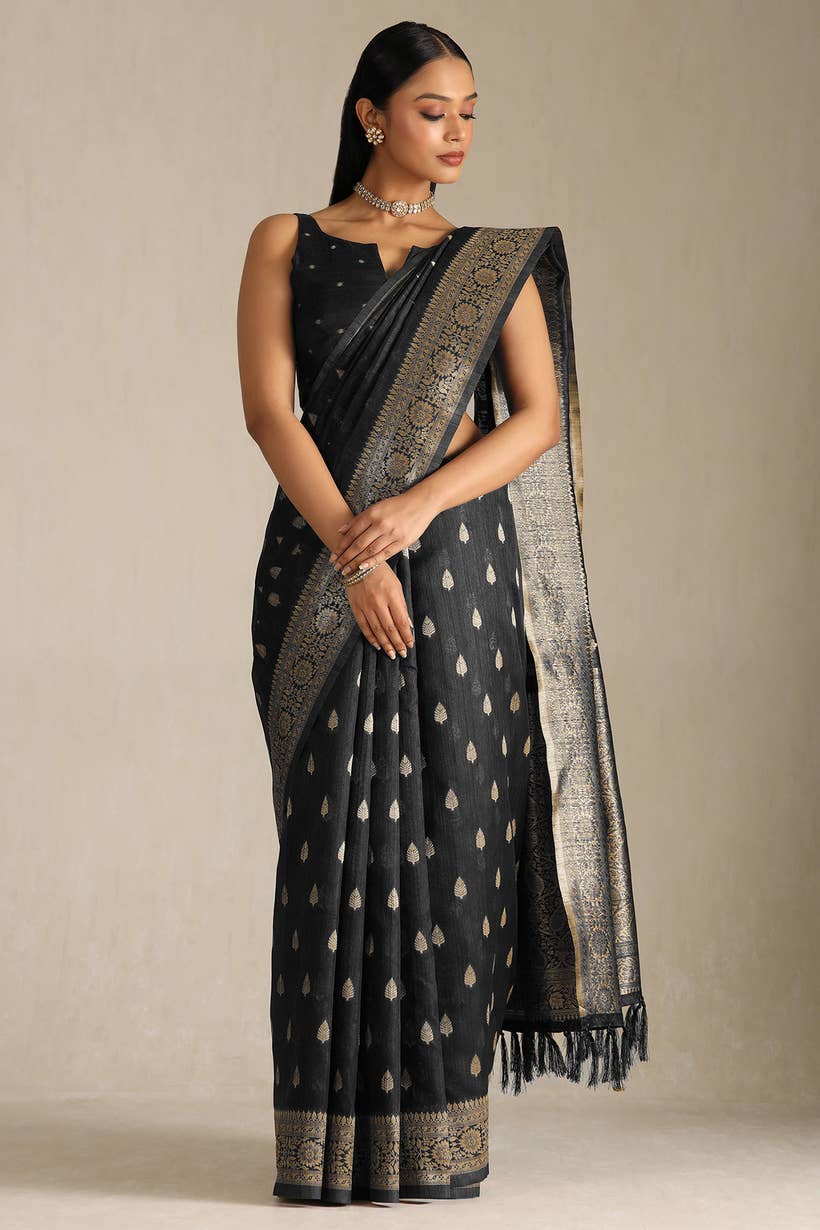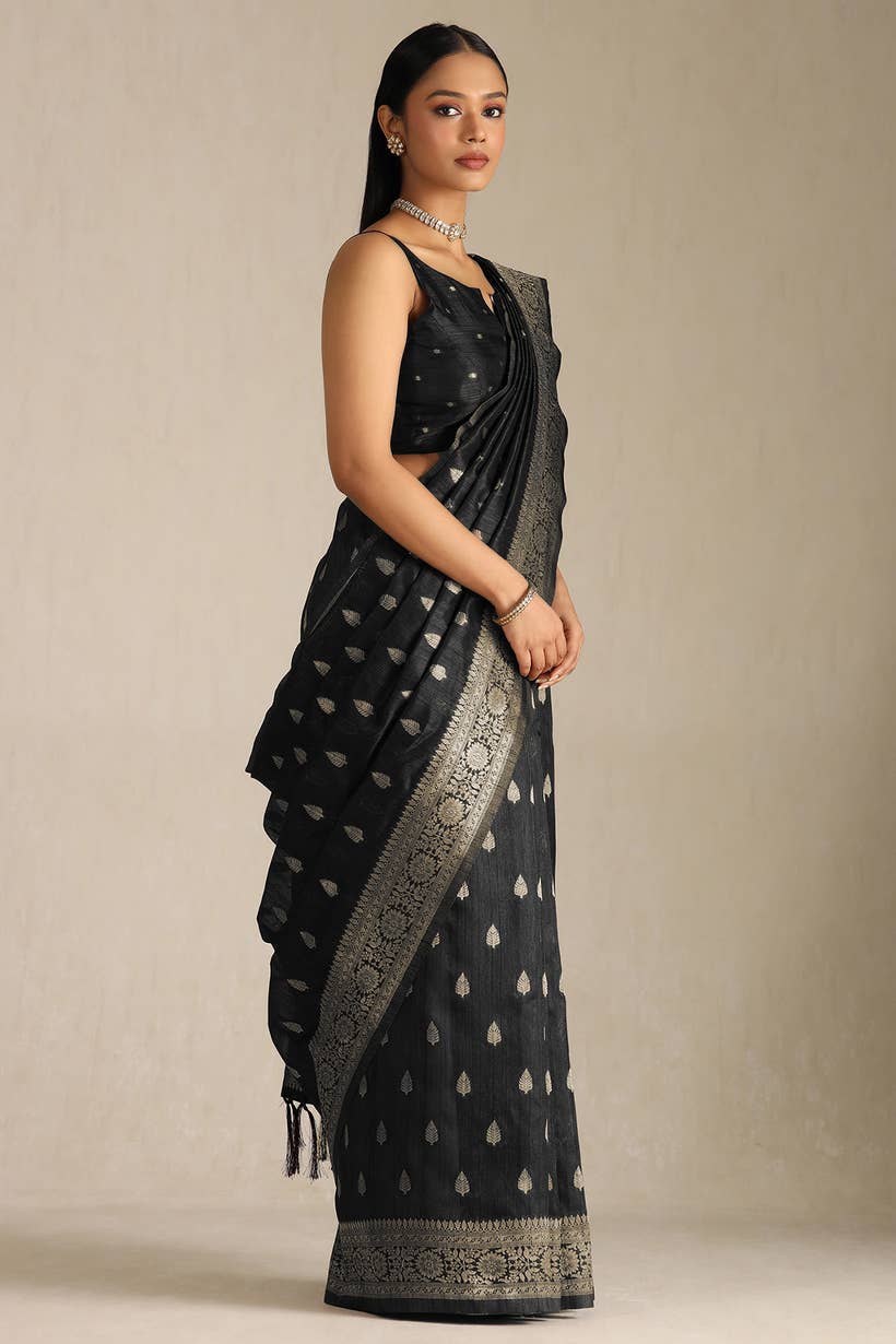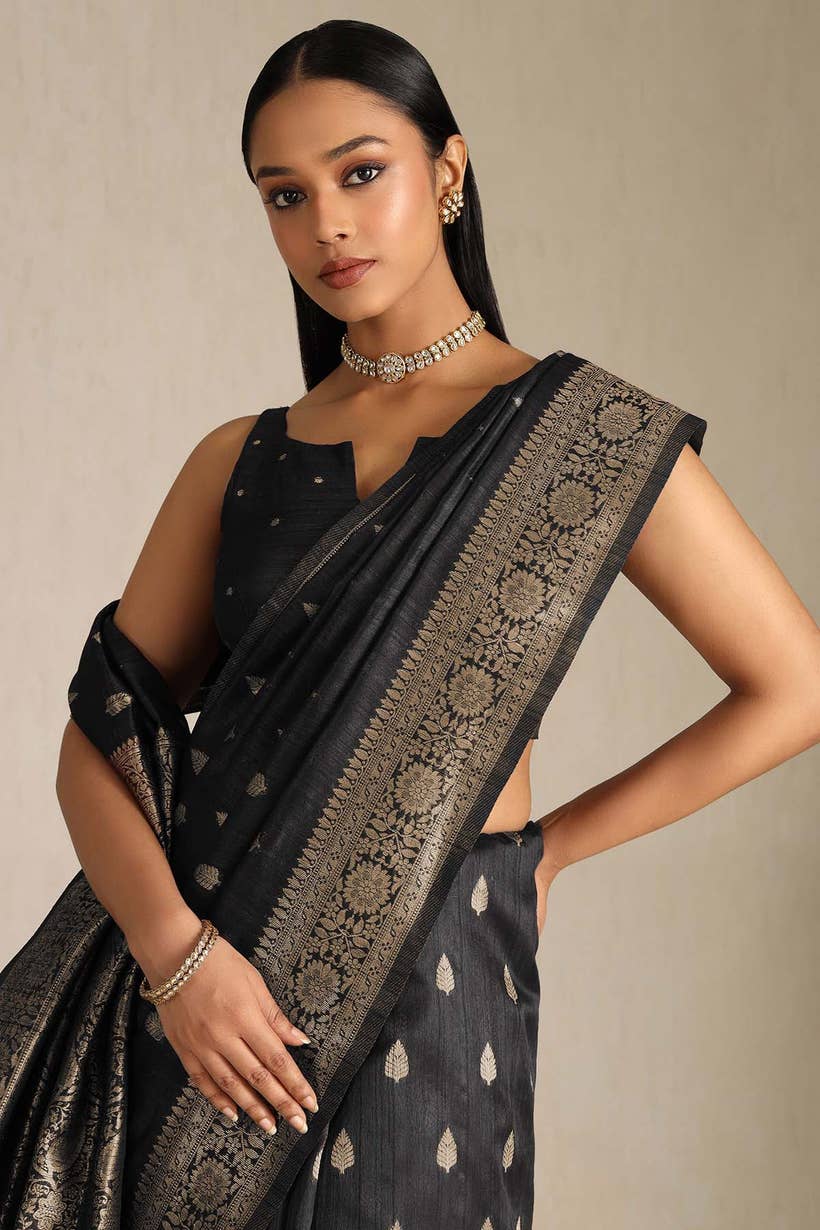 Adorn yourself with the subtle elegance of our black Tussar zari-woven saree. Paired with an unstitched blouse offers endless customization possibilities. Tailor your look to perfection by choosing your preferred neckline, opening style, closure type, and sleeve design, allowing you to express your unique style with grace and sophistication, making it a refined choice for any special occasion.